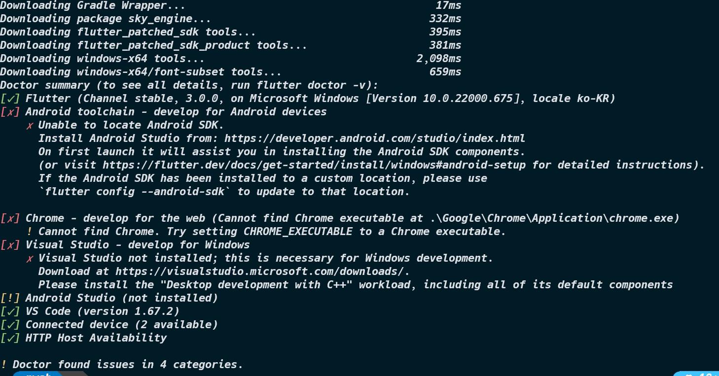 플러터 닥터를 실행해서 확인해보면 라이센스를 등록하라고 나온다.