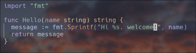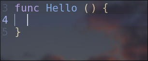 func 로 함수임을 선언하며 Hello 는 우리가 사용할 함수 이름, 소괄호() 안에는 파라메터(인자) 가 들어갑니다. 파라메터가 어떤 타입인지 선언을 해줘야 하며, 파라메터는 생략될 수 있습니다. 마지막으로 리턴타입도 마찬가지로 생략될 수 있습니다.